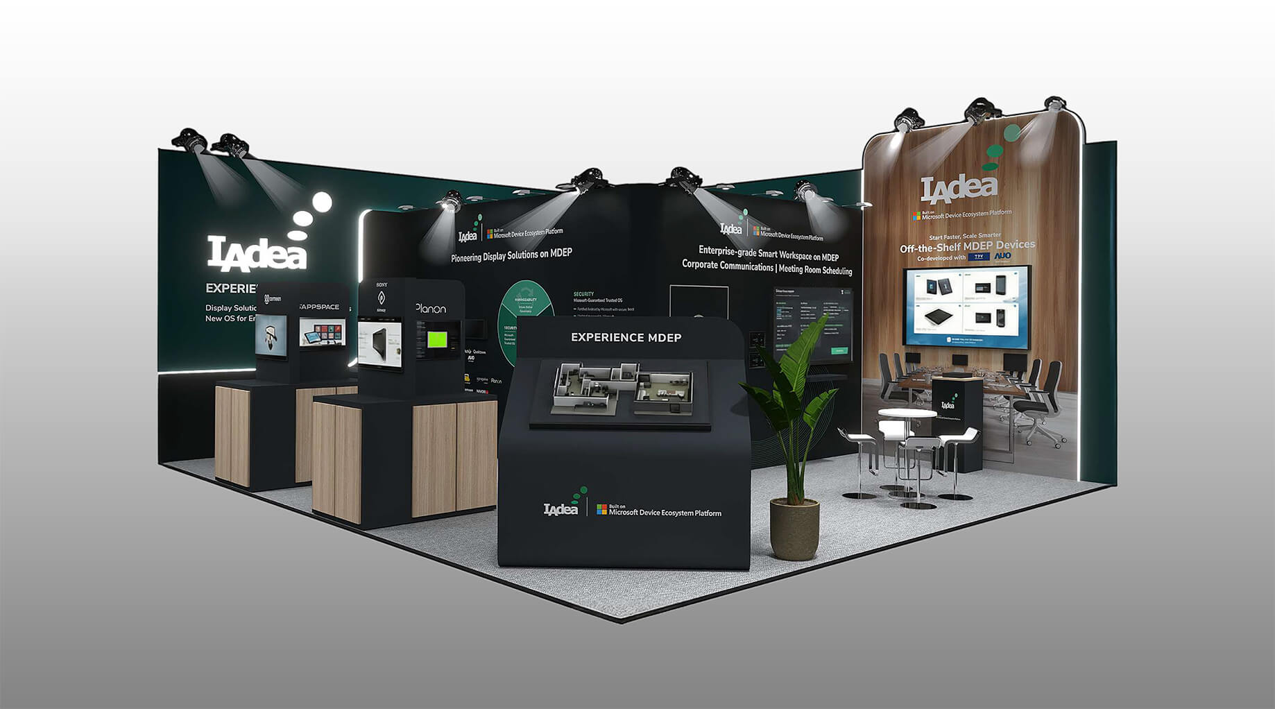 Rendering of the IAdea booth at ISE 2026, featuring live demonstrations of enterprise display solutions built on the Microsoft Device Ecosystem Platform (MDEP). The exhibit showcases IAdea DSM™ alongside software and hardware partners, highlighting secure, scalable, and centrally managed display environments for digital signage, workplace experience, and emerging AI-driven use cases.